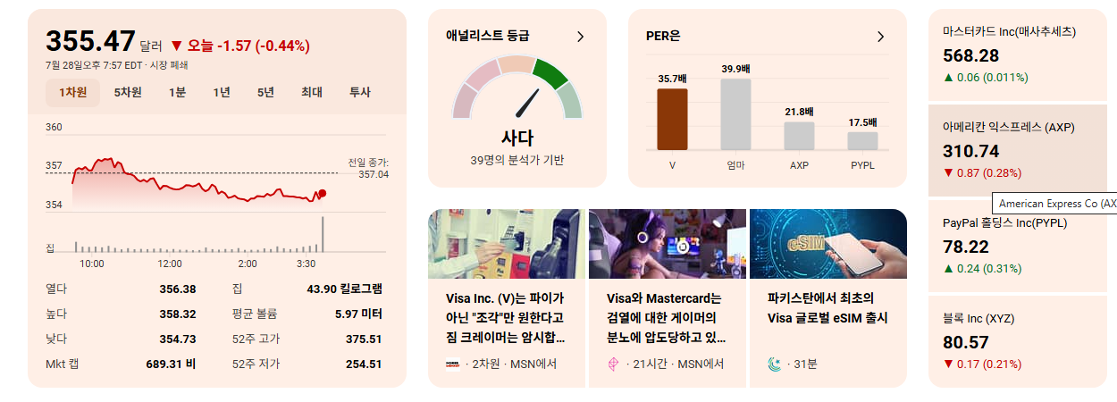 - 보도 시점 직전, 비자 주가는 소폭 0.4% 하락하여 355.47달러에 마감했습니다. 이는 실적 발표에 대한 경계감과 함께 일본의 규제 소식이 복합적으로 작용한 결과로 보입니다.