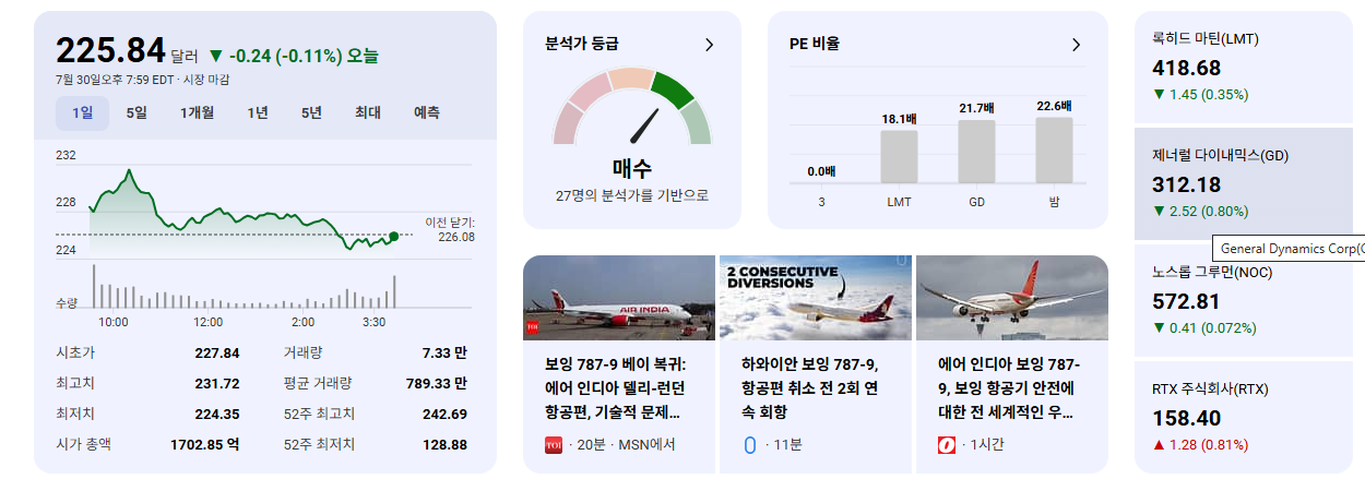 - 또한, 지정학적 긴장 고조로 인한 방위 부문의 꾸준한 수요 역시 보잉의 실적에 긍정적인 영향을 미치고 있을 수 있습니다.
