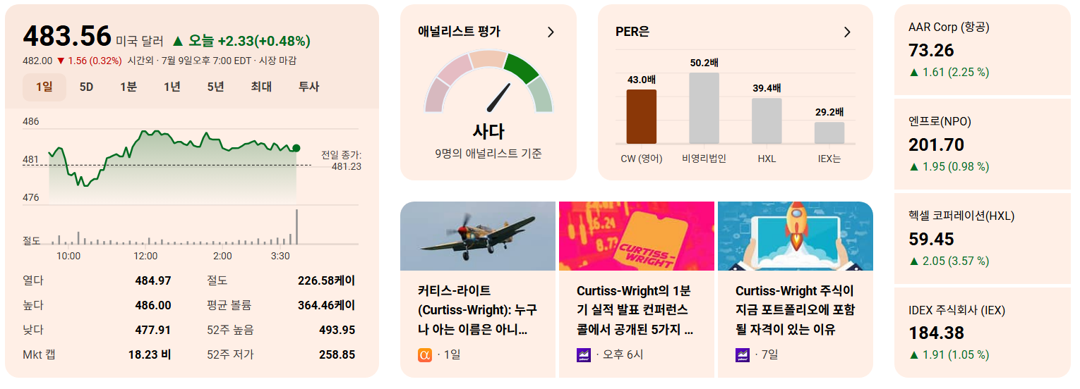 • 종합 평가: 커티스-라이트(CW)는 매우 견고한 펀더멘털과 역사적인 안정성을 바탕으로 꾸준히 성장해 온 기업입니다. 최근 1분기 매출의 13% 증가와 지난 52주간 79.24%에 달하는 주가 상승CW의 사업 모델이 여전히 강력하며, 시장에서 긍정적으로 평가받고 있음을 명확히 보여줍니다.