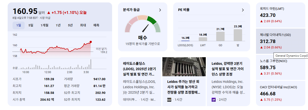- 전 세계적으로 지정학적 긴장이 고조될수록 국방 관련 기업들의 가치는 더욱 부각됩니다. LDOS는 이러한 거시적인 흐름 속에서 상대적으로 안정적이고 예측 가능한 수익 흐름을 제공할 수 있는 기업으로 평가됩니다.