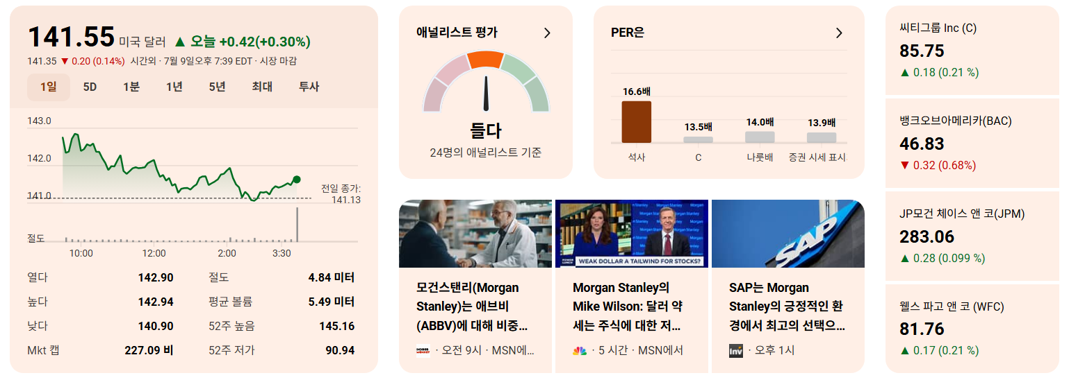 • 가치주 투자자: 금융주는 일반적으로 경기 순환적 특성을 가지지만, 모건 스탠리의 다각화된 사업 포트폴리오와 강력한 자본력은 상대적인 안정성과 가치를 제공합니다.