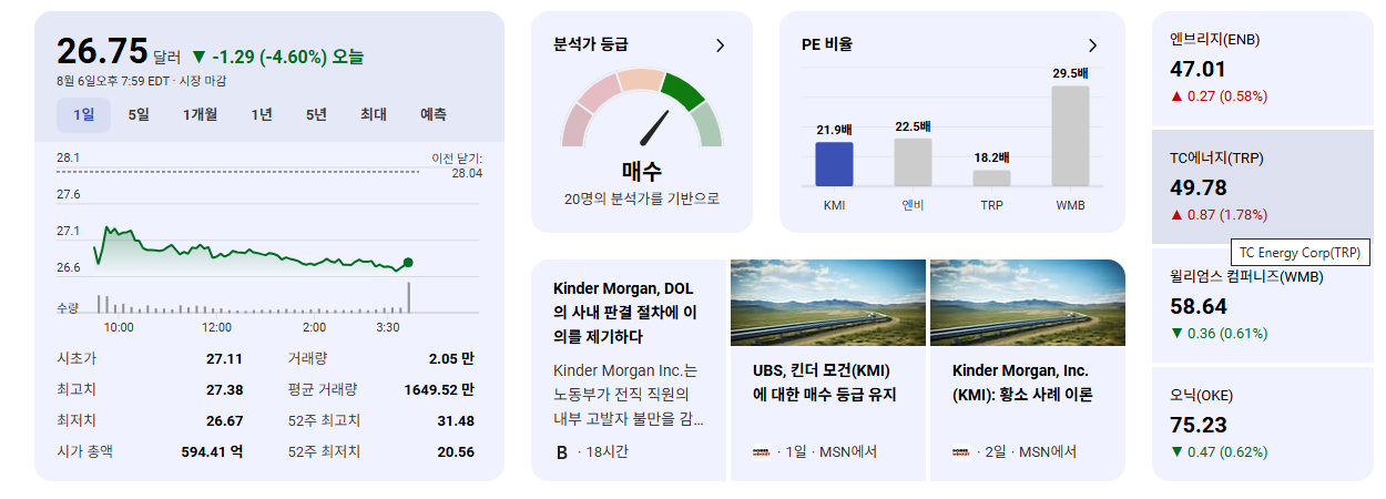 • 투자 시사점: KMI는 안정적인 현금 흐름, 성장하는 프로젝트 잔고, 그리고 전력 수요 증가라는 장기적 트렌드에 힘입어 꾸준한 성장을 기대할 수 있는 기업입니다. 장기적인 관점에서 안정적인 수익과 배당 수익을 추구하는 투자자에게 적합한 종목으로 평가됩니다.