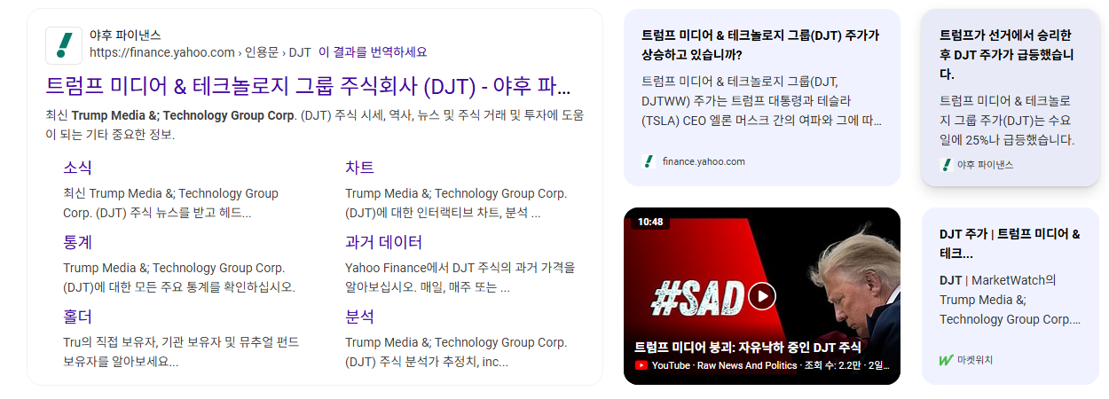 • 정치적 요인 주시: DJT 투자는 단순히 기술 기업에 대한 투자가 아니라, 도널드 트럼프 전 대통령의 정치적 미래에 대한 일종의 베팅에 가깝습니다. 그의 선거 운동, 법적 문제, 그리고 대선 결과 등이 주가에 막대한 영향을 미칠 것입니다.
