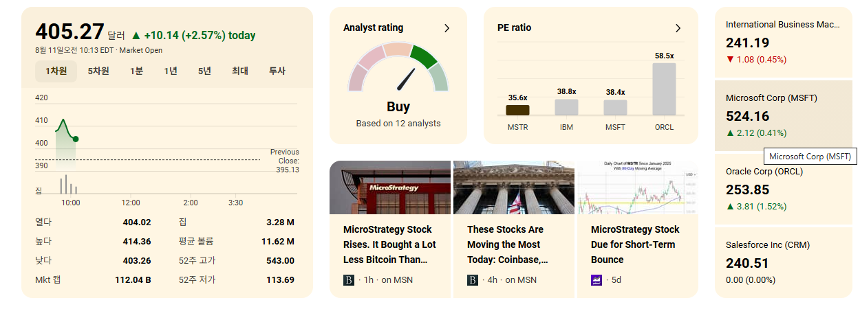 - 주요 경쟁 대상의 변화: 이제 MSTR의 주가는 전통적인 소프트웨어 기업의 실적보다는 비트코인 가격 움직임에 훨씬 더 크게 좌우됩니다. 따라서 경쟁사는 유사한 투자 전략을 가진 다른 기업들이 될 수 있습니다.