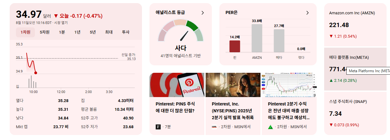 Yahoo Finance에서 2025년 8월 9일 보도한 기사에 따르면, 핀터레스트(PINS)가 2분기 주당순이익(EPS)은 시장 예상치를 하회했으나, 월간 활성 사용자(MAU) 증가와 강력한 3분기 매출 가이던스를 제시하며 장기 투자자들에게 긍정적인 신호를 보냈습니다. 특히 뱅크오브아메리카(BofA)는 AI 기반 광고 도구와 구글, 아마존과의 파트너십 확대를 긍정적으로 평가하며 주가 하락을 매수 기회로 조언했습니다.