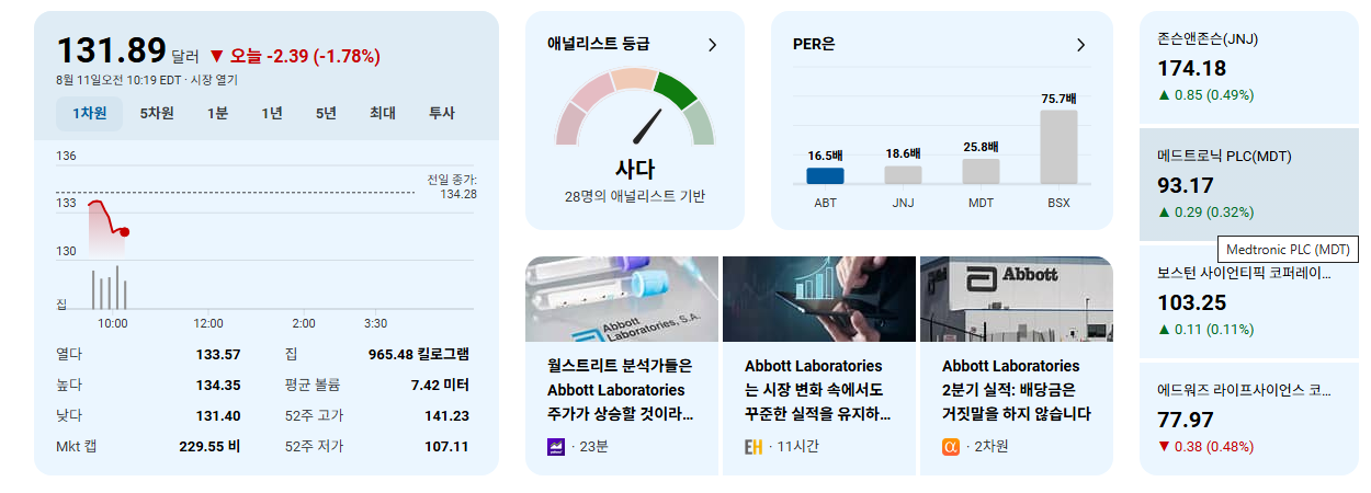 - (추가 정보) ABT는 50년 이상 꾸준히 배당금을 늘려온 배당 귀족주(Dividend Aristocrat)로, 안정적인 현금흐름과 주주환원 정책 또한 매력적입니다.