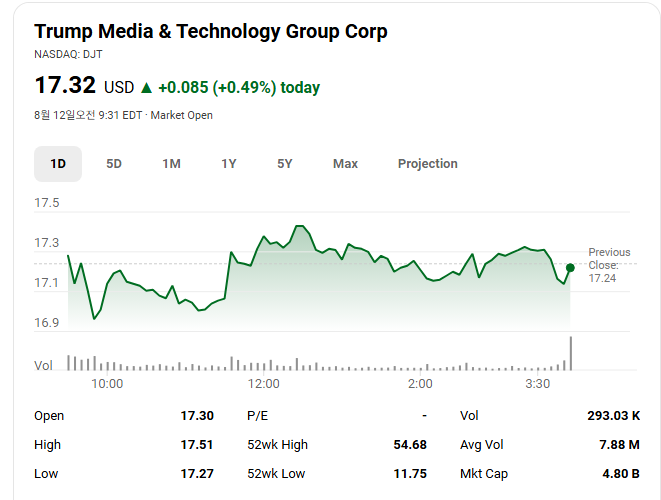 • 지속적인 시장 관심 시사: DJT가 특정 기업 뉴스가 없음에도 불구하고 다양한 일반 경제/시장 뉴스에서 ‘트렌딩’ 종목으로 꾸준히 언급된다는 것은 투자자들 사이에서 해당 종목에 대한 높은 관심과 활발한 논의가 이루어지고 있음을 의미합니다.