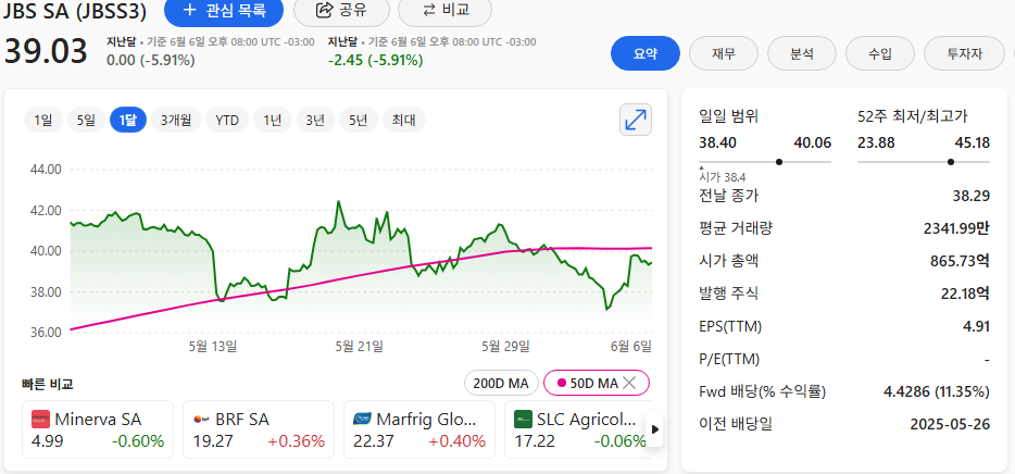 - 방어주로서의 역할: 현재와 같이 시장 변동성이 크고 경제 불확실성이 높은 시기에는 JBS와 같은 필수 소비재 기반의 방어주가 포트폴리오의 안정성을 높이는 역할을 할 수 있습니다. 배당 정책도 함께 고려할 필요가 있습니다.