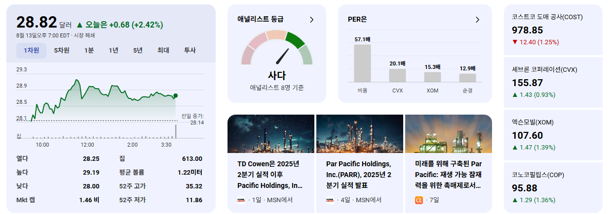 • PARR는 현재 긍정적인 운영 성과와 애널리스트의 지지를 받고 있는 매력적인 에너지 주식입니다. 특히 다각화된 사업 구조와 지속 가능한 에너지로의 확장 노력은 장기적인 관점에서 긍정적인 요소입니다.