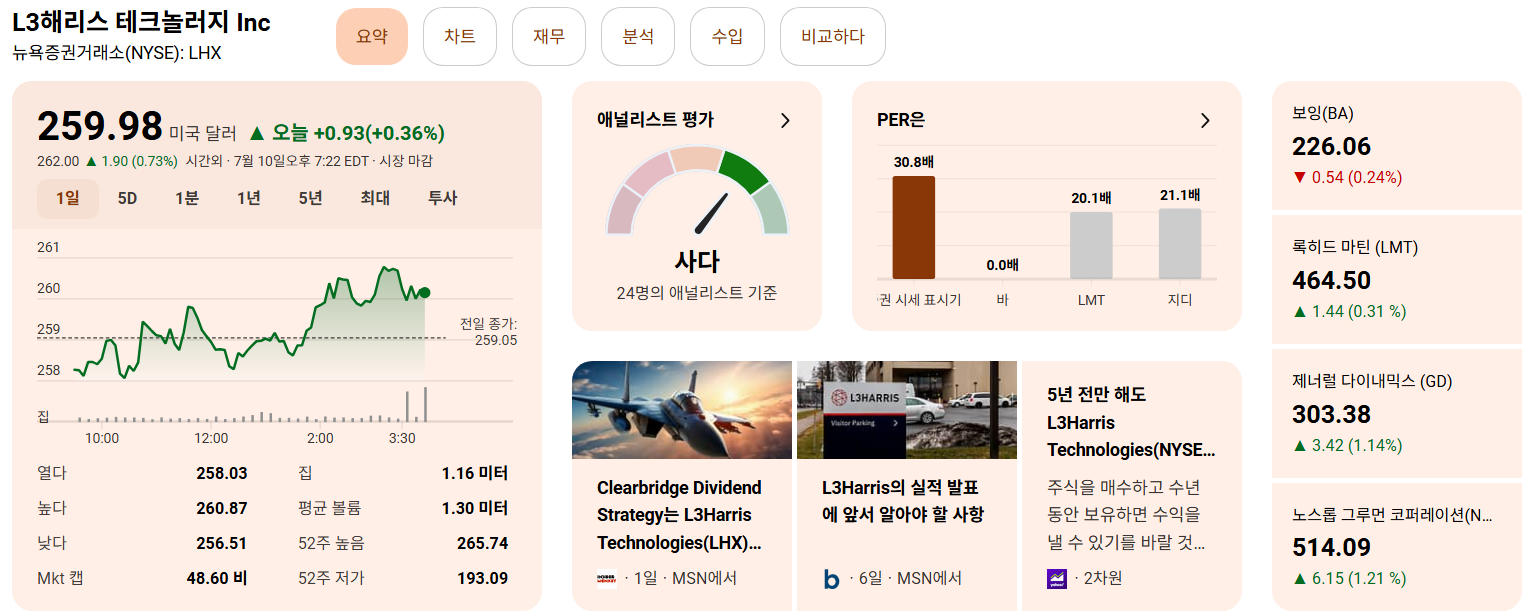 Yahoo Finance에서 2025년 7월 9일 보도한 기사에 따르면, L3Harris Technologies(LHX)에 대해 투자 운용사 ClearBridge Dividend Strategy가 주가 하락 시점에 맞춰 신규 포지션을 구축했다고 밝혔습니다. ClearBridge는 LHX가 매력적인 밸류에이션과 견고한 재무 상태를 가졌으며, 지정학적 갈등 심화로 인한 강력한 국방 지출 증가가 예상되어 안전한 투자처라고 평가했습니다.