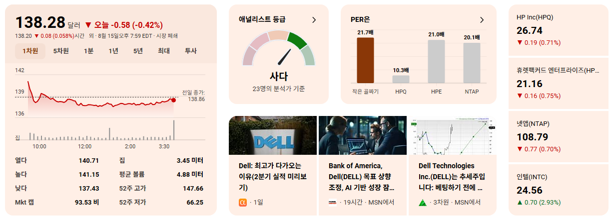 - AI 및 데이터 시대의 핵심 인프라 제공자: DELL의 서버와 스토리지 솔루션은 AI 및 빅데이터 처리에 필수적인 기반 인프라를 구성합니다. 생성형 AI 시대의 확산과 함께 기업들의 AI 인프라 구축 수요가 급증하면서, DELL은 이 분야의 직접적인 수혜를 받을 것으로 예상됩니다.