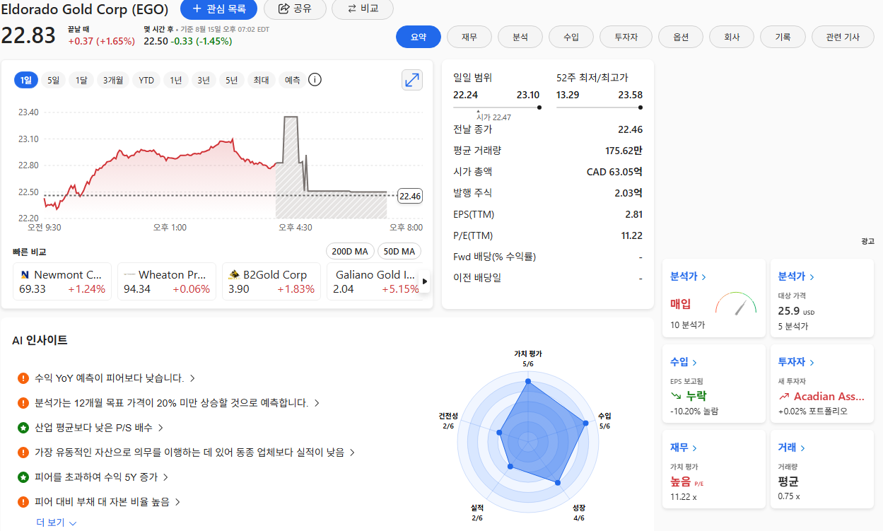 • 결론 및 투자자 시사점: EGO는 최근 발표된 견조한 실적과 핵심 성장 프로젝트의 진척을 바탕으로 긍정적인 투자 모멘텀을 형성하고 있습니다. 장기적인 관점에서 금 및 구리 수요 증가와 함께 EGO의 생산 능력 확장이 시너지를 낼 경우, 충분한 투자 매력을 가질 수 있습니다. 다만, 원자재 시장의 특성상 변동성이 크므로 **분산 투자 전략**과 함께 **지속적인 시장 모니터링**이 중요합니다.