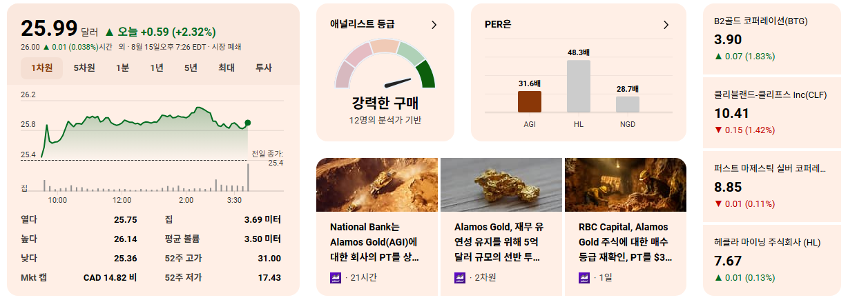 금값 상승세 올라탄 알라모스 골드(AGI): 2분기 기록적 실적과 향후 전망 분석 본문