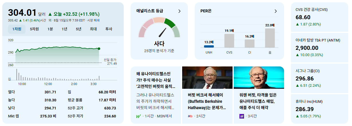 - 현재 UNH의 선행 주가수익비율(Forward P/E)은 약 16.75배로, 경쟁사인 CVS Health의 10.51배보다 높게 거래되고 있습니다.