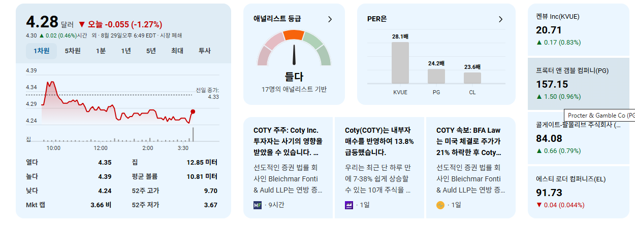 • 밸류에이션 매력 부각: 주가가 낮은 수준에서 경영진이 대규모 매입을 했다는 것은 현재 COTY의 주식이 내재 가치에 비해 저평가되어 있을 가능성을 시사합니다.