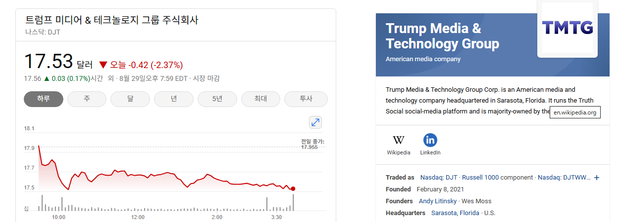 - 트럼프 리스크/프리미엄: DJT의 주가는 도널드 트럼프 전 대통령과의 직접적인 연관성 때문에 일반적인 기업 가치 평가와는 다른 요인으로 움직이는 경향이 있습니다. 그의 정치적 영향력, 대선 결과, 또는 개인적인 이슈에 따라 주가 변동성이 매우 클 수 있습니다. 기사에서 언급된 트럼프 관련 소식은 이러한 정치적 프리미엄/리스크가 여전히 시장에서 중요한 요소임을 보여줍니다.