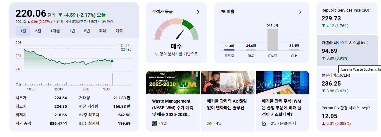 - 경쟁사 Republic Services (RSG)와의 주가 성과 차이 원인을 면밀히 분석하고, WM의 시장 점유율 또는 성장 전략에 변화가 있는지 주시할 필요가 있습니다.
