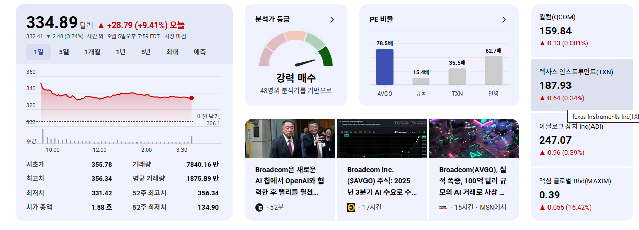 - 주가 급등 및 시가총액 증가: 브로드컴(AVGO) 주가가 9.41% 급등하여, 시가총액이 약 1,350억 달러 증가해 총 1조 6천억 달러에 육박하며 사상 최고치를 기록했습니다. 이는 AI 칩 시장에서의 강력한 성장 기대감을 반영합니다.