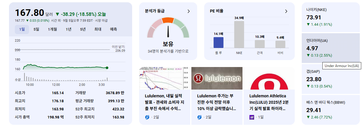 - 주가 급락: 지난 금요일(2025년 9월 5일) LULU 주가는 하루 만에 18.6% 폭락하며 S&P 500 내에서 가장 큰 하락폭을 기록했습니다.