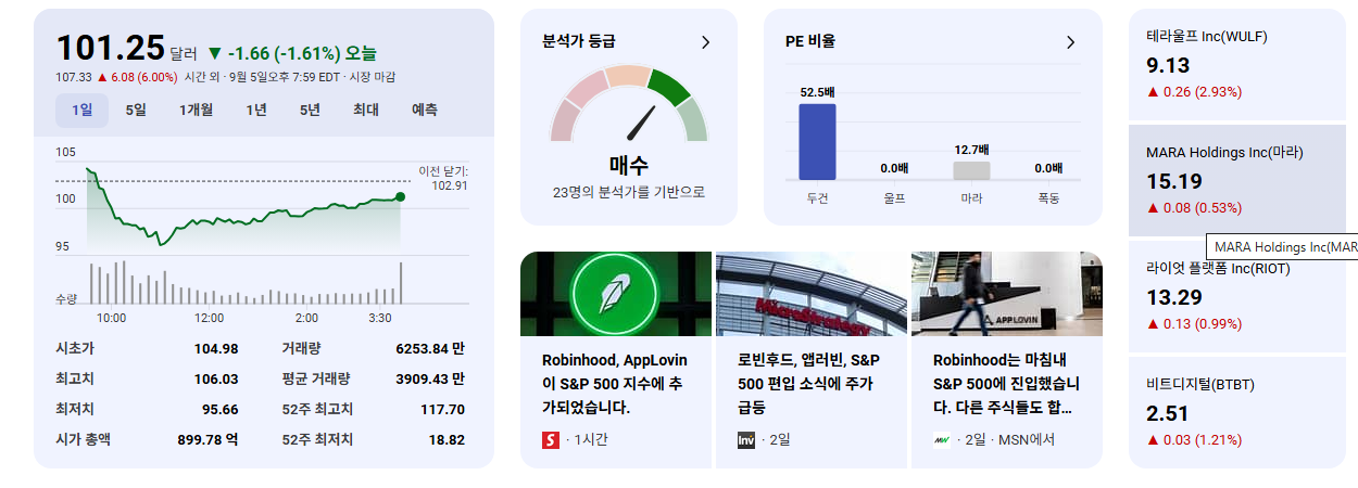 - S&P 500 편입으로 인한 주가 급등: 발표 직후 시간 외 거래에서 Robinhood 주가는 7% 급등했으며, $101를 넘어 $108 이상으로 치솟았습니다. 올해 들어 주가는 150% 이상 상승했습니다.