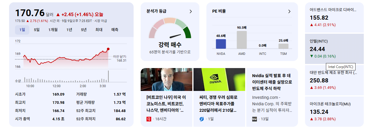 - 엔비디아(NVDA)는 AI 및 데이터 센터 GPU 시장의 압도적인 선두 주자이며, 특히 대규모 AI 모델 훈련(Training) 단계에서 확고한 시장 리더십을 가지고 있습니다.