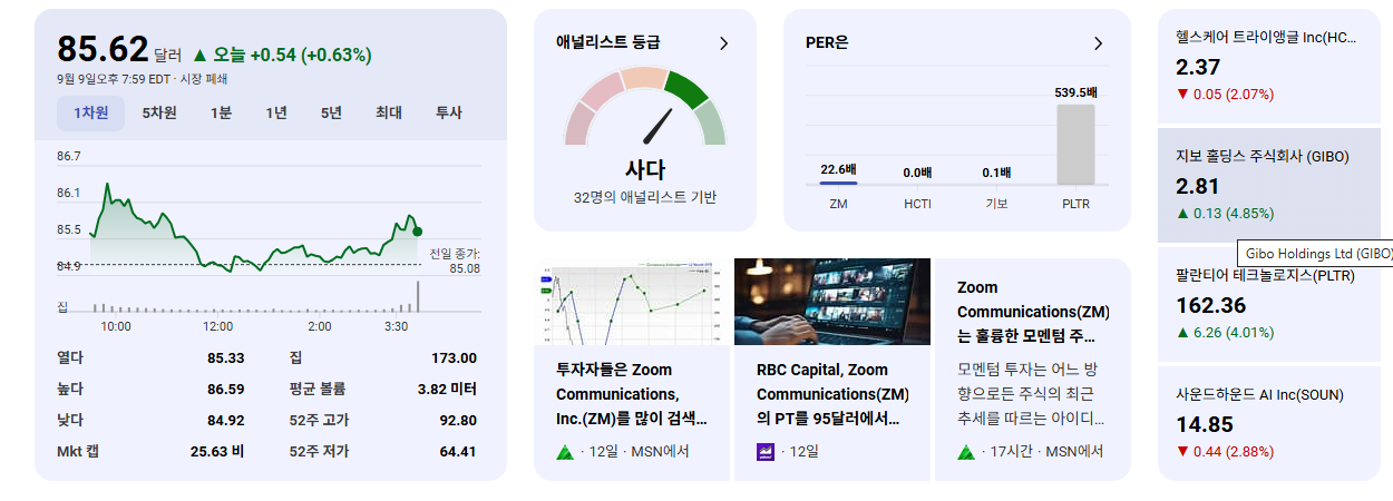 • 애널리스트 보고서 발행: Argus가 줌 비디오 커뮤니케이션즈(ZM)에 대한 개별 애널리스트 보고서를 발행했다는 사실은 ZM이 기관 투자자 및 분석가들의 지속적인 주목을 받고 있음을 시사합니다. 이는 시장 내 ZM의 중요성과 투자 매력을 간접적으로 보여주는 긍정적인 신호로 해석될 수 있습니다.