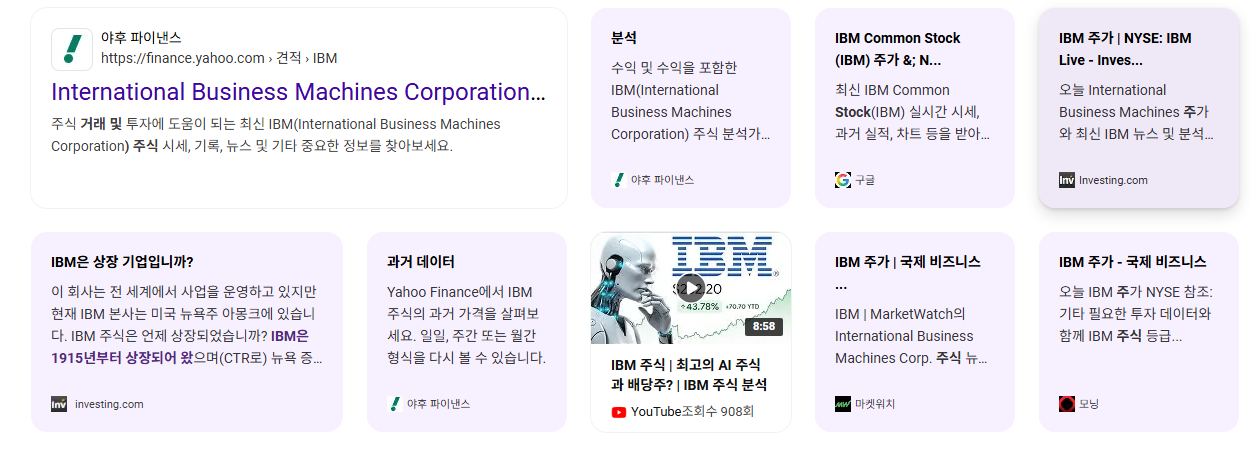 • IBM 주가는 올해 들어 15% 상승했지만, 최근 실적 발표 후 소프트웨어 매출 부진(특히 메인프레인 부문)으로 9.9% 하락했습니다.
