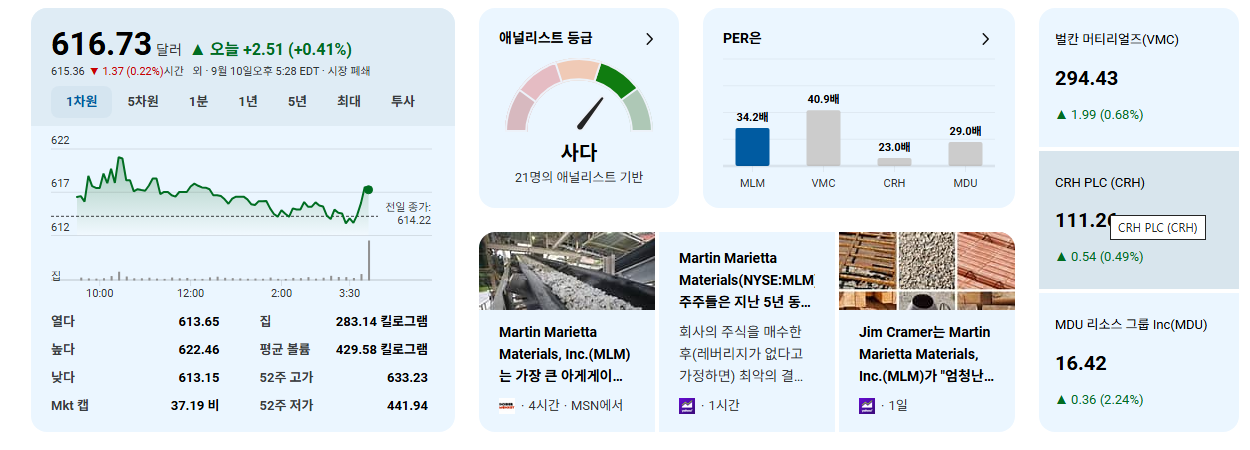 • 강력한 펀더멘털과 성장 동력: 짐 크레이머의 긍정적 발언은 MLM미국 건설 시장의 견고한 수요를 바탕으로 견조한 실적을 이어갈 가능성이 높다는 점을 시사합니다. 특히 대규모 인프라 투자 확대는 향후 몇 년간 MLM의 성장을 견인할 주요 동력이 될 것입니다.