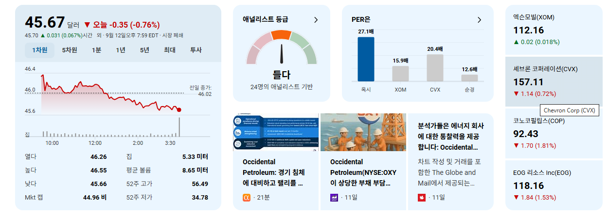 - 최근 유가가 2022년 $110에서 현재 약 $65 수준으로 하락했으며, 연말까지 $60 아래로 떨어질 수 있다는 전망은 OXY의 수익성에 직접적인 타격을 줍니다.