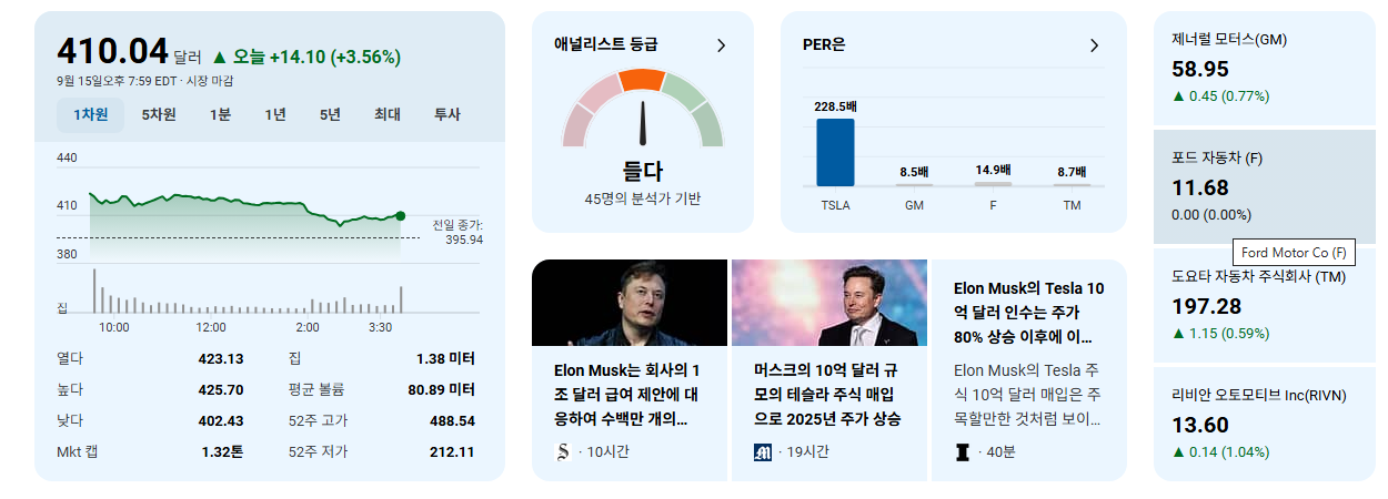 - 일론 머스크의 주식 매수와 연준의 금리 인하 기대감은 TSLA 주가에 긍정적인 단기 모멘텀을 제공하고 있습니다. 이는 투자 심리 개선과 함께 주가의 추가 상승 동력으로 작용할 수 있습니다.