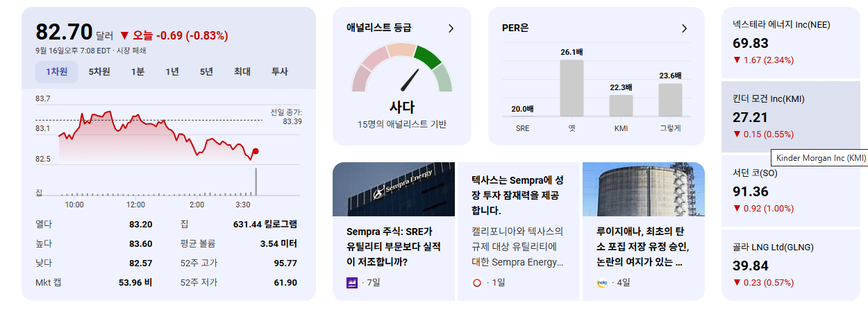 - 미래 성장 동력 및 ESG 강조: Sempra LNG를 통한 북미 액화천연가스(LNG) 인프라 확장과 멕시코 합작법인 IEnova의 재생에너지 및 재생 수소 투자 계획, 그리고 2050년 탄소 중립 목표는 장기적인 기업 가치 상승에 긍정적인 요인입니다.