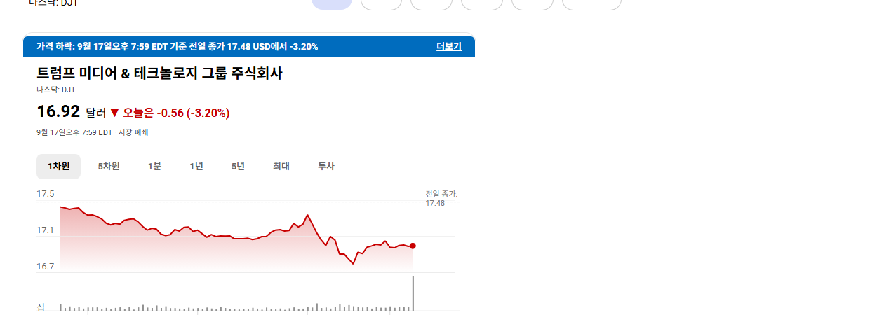 - 금리 인하는 일반적으로 시장 전반의 유동성을 공급하고 위험 자산에 대한 투자 심리를 개선시킵니다. 이는 DJT와 같이 성장 잠재력에 대한 기대(혹은 정치적 기대)가 높은 주식에 단기적인 매수 압력으로 작용할 수 있습니다.