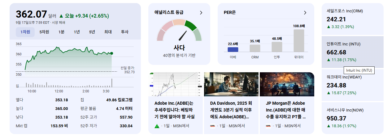 • 뉴스에서도 어도비를 "AI Stocks in the Spotlight"으로 언급하며 AI와의 연관성을 강조하고 있습니다.