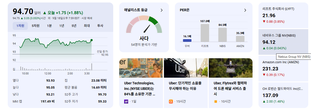 • UBER는 여전히 글로벌 승차 공유 및 음식 배달 시장의 선두 주자입니다. 드라이버 수입에 대한 논의는 끊이지 않지만, UBER의 방대한 사용자 기반과 효율적인 플랫폼 운영은 여전히 강력한 경쟁 우위로 작용합니다.