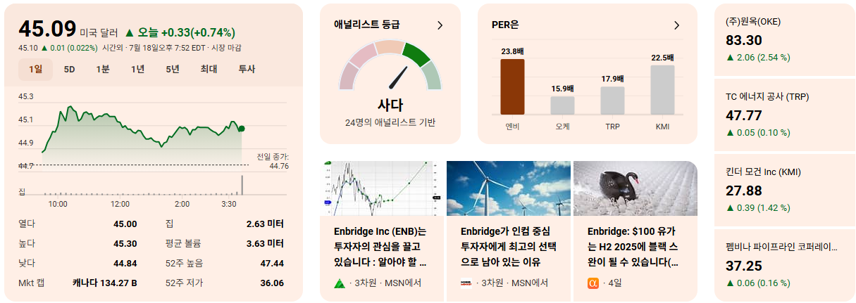 - 종합적으로 볼 때, ENB는 장기적인 관점에서 꾸준한 소득을 원하는 투자자나 포트폴리오에 안정성을 더하고 싶은 투자자에게 매력적인 '핵심 보유 종목(Core Holding)'이 될 수 있습니다. 견고한 펀더멘털과 검증된 배당 이력을 바탕으로 안정적인 수익 흐름을 제공할 것으로 기대됩니다.