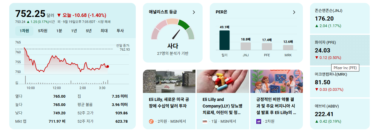 • 다만, 노보 노디스크와 같은 강력한 경쟁사의 존재, 신약 개발 과정에서의 규제 리스크 및 임상 실패 가능성은 항상 염두에 두어야 할 투자 위험 요소입니다. 경쟁사의 신제품 출시 및 임상 결과, 그리고 LLY 파이프라인의 진행 상황을 지속적으로 모니터링하는 것이 중요합니다.
