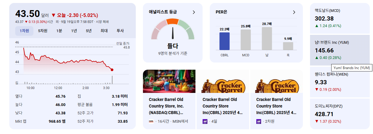 - 장기적 관점: 크래커 배럴의 브랜드 가치와 잠재력을 높이 평가하는 장기 투자자라면, 현 사태가 오히려 매수 기회가 될 수도 있습니다. 그러나 이는 경영권 분쟁 해결과 실적 회복에 대한 확신이 선 이후에 고려되어야 합니다.
