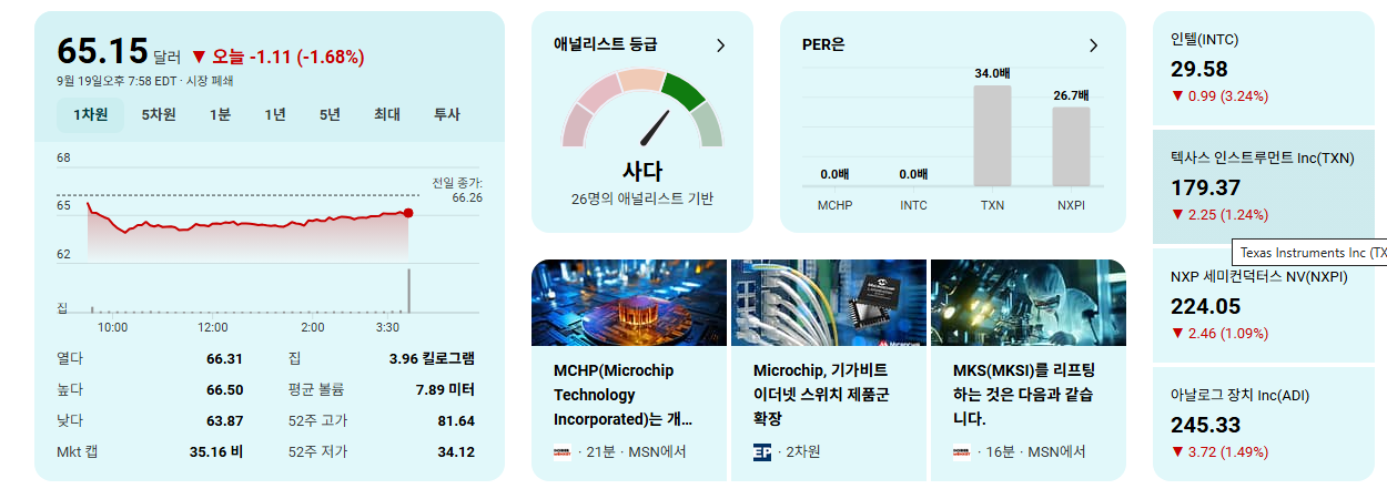- MCHP 주가는 2025년 9월 19일 기준으로 지난 1개월간 -4.96%, 지난 52주간 -15.46% 하락하여 단기 및 중기적으로 부진한 흐름을 보였습니다.