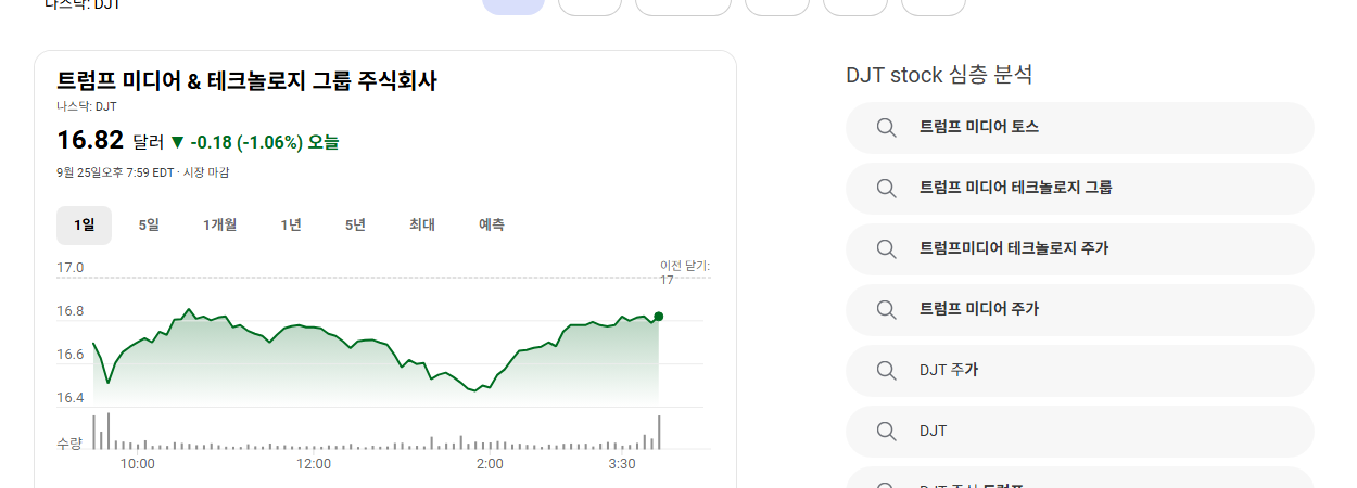 - DJT의 높은 화제성: 여러 기사 하단에 DJT가 'What's trending' 목록에 지속적으로 등장하는 것은, 비록 직접적인 기업 분석은 없지만, 이 주식이 투자자들 사이에서 높은 화제성을 가지고 꾸준히 주목받고 있음을 의미합니다.