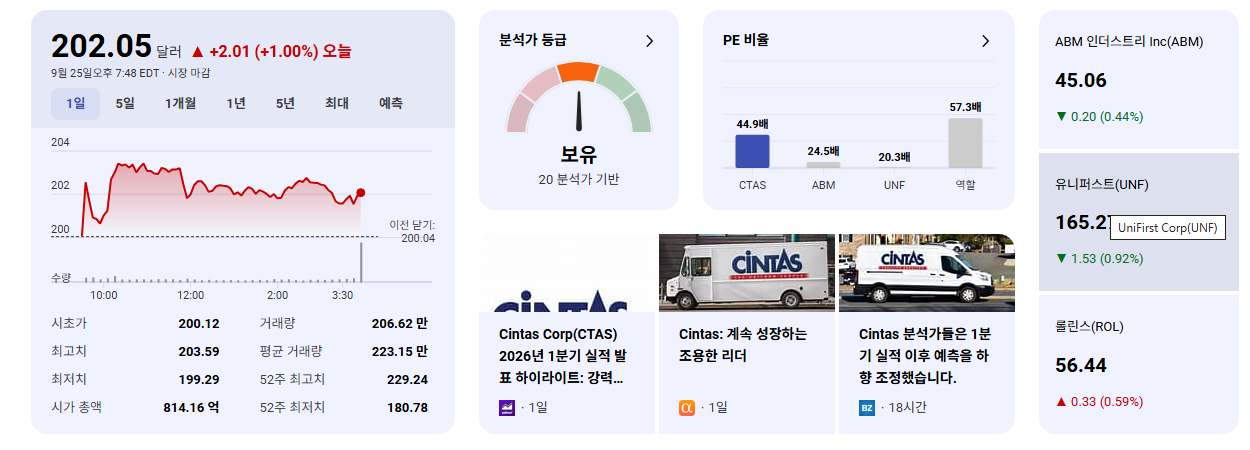 • 경기 방어적 특성: CTAS가 제공하는 서비스는 기업 운영에 필수적이므로, 경기 침체기에도 비교적 안정적인 수요를 유지하는 '경기 방어주'의 특성을 가집니다. 이는 불안정한 시장 상황에서도 주가 하방 경직성을 제공하는 요인이 됩니다.