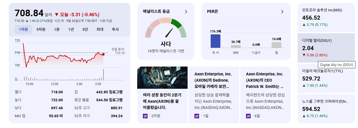 - 보수적 투자자: Axon은 이미 시장에서 인정받는 성장주이므로, 급격한 주가 변동성보다는 꾸준한 성장을 기대하는 투자자에게 적합합니다. 분할 매수 전략을 통해 시장 변동성에 대비하고, 분기별 실적 발표 및 신규 계약 소식에 주목하며 장기 보유 관점을 유지하는 것이 바람직합니다.
