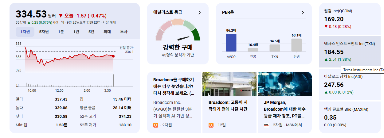 - 공격적 투자자: Broadcom은 AI 및 클라우드 인프라 성장의 핵심 수혜주 중 하나입니다. AI 관련 신제품 출시나 대형 고객 확보 소식에 주목하여 추가적인 상승 모멘텀을 활용할 수 있습니다. 다만, 기술주의 특성상 시장 변동성에 대한 대비가 필요합니다.