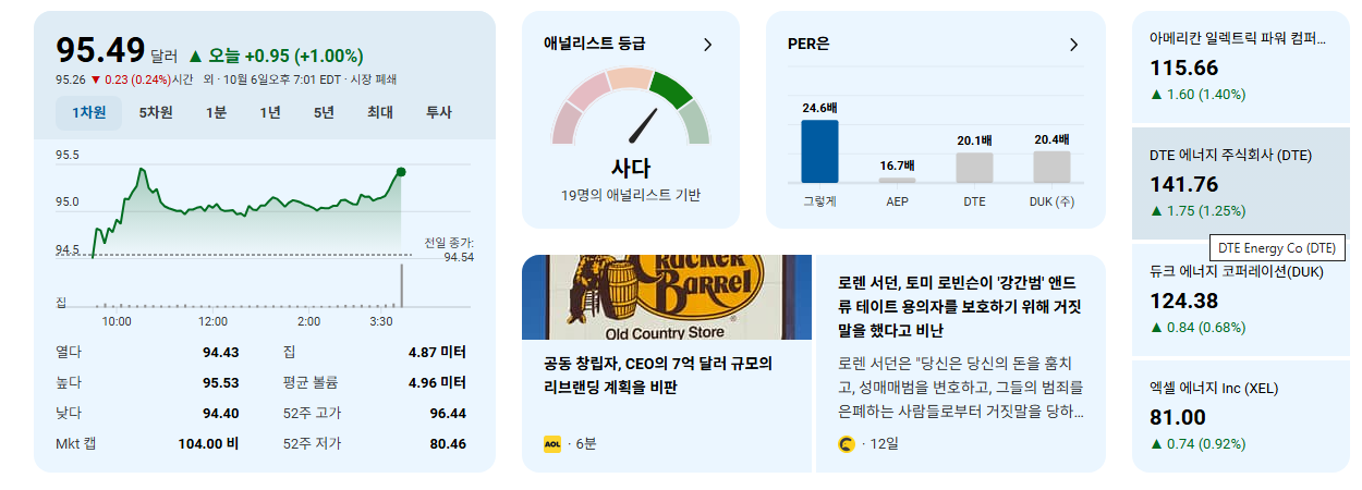 - 단기: 유틸리티 섹터는 일반적으로 시장 변동성이 낮아 급격한 주가 상승보다는 안정적인 흐름을 보일 가능성이 높습니다. 금리 인상기에는 다소 약세를 보일 수 있으나, 견고한 배당금은 주가 하방 경직성을 제공합니다.