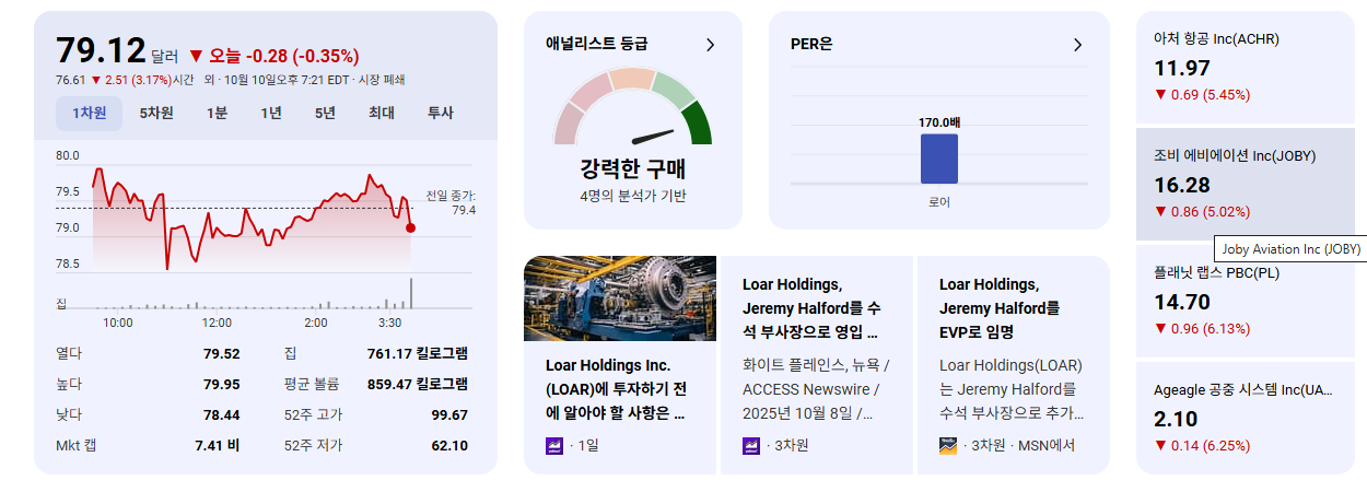 - 단기 주가 변화 예상: 현재 LOAR 주가는 개별적인 호재나 악재 뉴스가 없는 상황에서는 넓은 시장 흐름과 항공우주 및 방산 섹터의 전반적인 분위기에 영향을 받을 가능성이 높습니다. IPO 이후 초기 변동성이 클 수 있으며, 주요 고객사의 수주 소식, 실적 발표, 또는 추가적인 인수합병 발표 등이 단기적인 주가 모멘텀으로 작용할 수 있습니다.