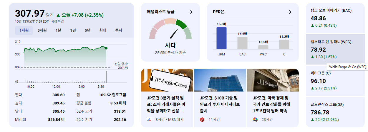 - JPM의 3분기 실적 발표 결과가 단기 주가 흐름을 결정할 핵심 요인이 될 것입니다. 애널리스트 기대치(rising profits)를 상회하는 실적을 발표할 경우 긍정적인 모멘텀을 받을 수 있습니다.