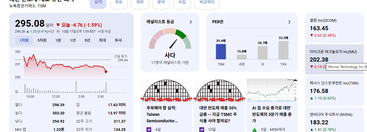 - TSM 주식은 연초 대비 52% 상승했지만, 52주 신고가($311.37) 대비 3.6% 하락한 상태입니다. 이는 강력한 3분기 실적과 AI 성장 전망에도 불구하고 단기적인 '눌림목'으로 해석될 수 있습니다.