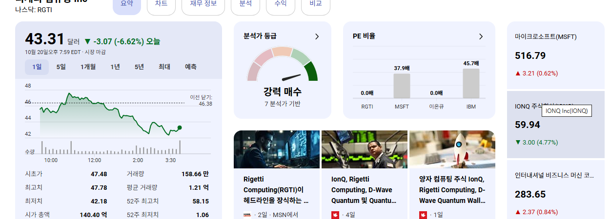 • 보수적 투자자: 양자 컴퓨팅 산업이 아직 초기 단계이며 Rigetti가 수익을 내지 못하고 있다는 점을 고려하여, 소액으로 분산 투자하거나 산업의 리스크가 완화될 때까지 관망하는 전략을 추천합니다.