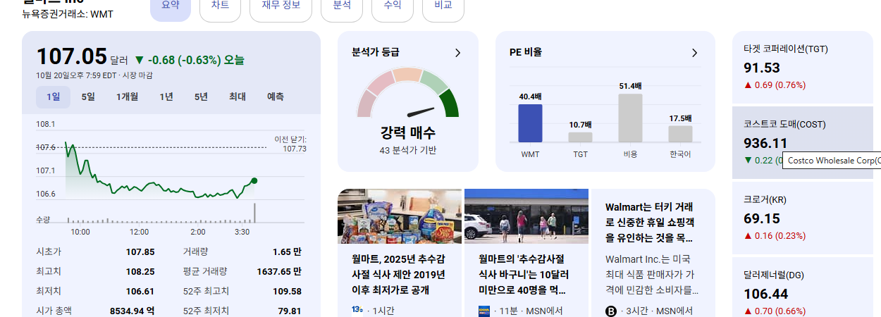 - 월마트는 경기 변동성에 비교적 강하며, 꾸준한 배당을 지급하는 배당 성장주의 특성을 가집니다. 3년 이상 장기 투자 시, 이러한 안정성을 높이 평가할 수 있습니다.