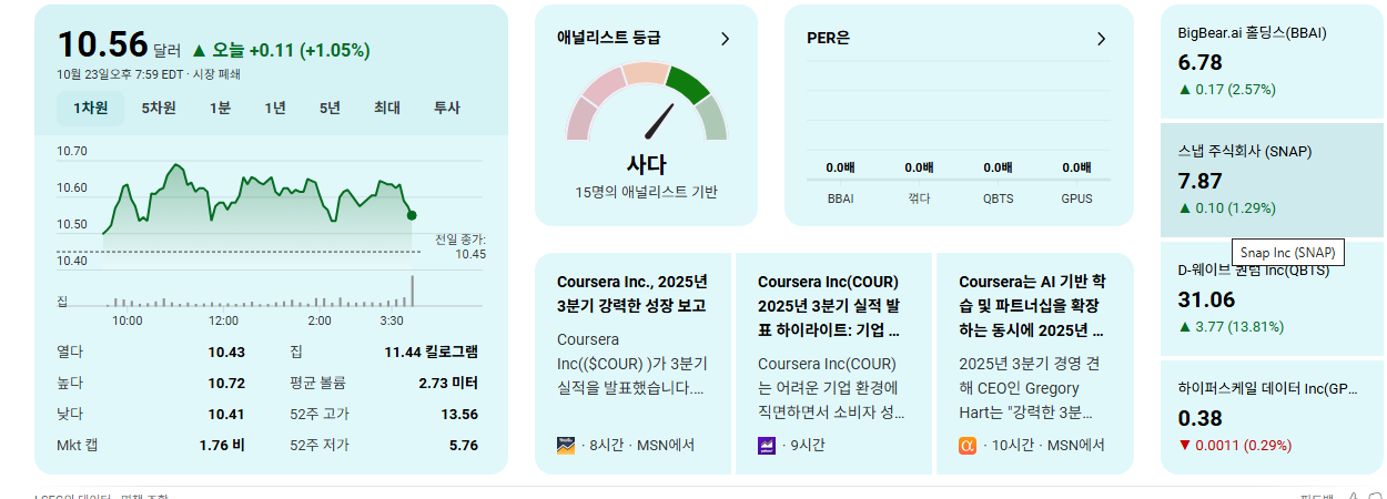 • 공격적 투자자: AI 교육 시장의 높은 성장 잠재력과 Coursera의 혁신 동력에 주목하여 투자 기회를 찾을 수 있습니다. 분할 매수 전략으로 리스크를 분산하고, 신임 CFO의 전략 방향과 AI 투자 성과를 주시하며 경쟁 환경 변화에도 주의를 기울여야 합니다. 현재 주가($10.25, 2025년 10월 15일 기준)에서 AI 모멘텀을 감안한 성장 여력을 평가할 필요가 있습니다.