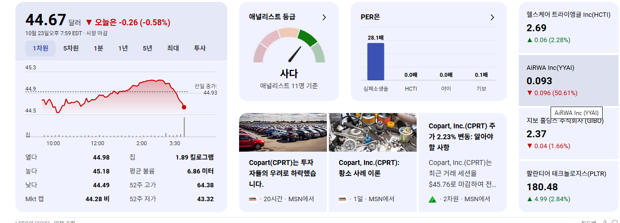 • 현재 주가는 $44.56 (2025년 10월 15일 기준)이며, Trailing P/E는 28.03배, Forward P/E는 25.38배를 기록하고 있습니다.